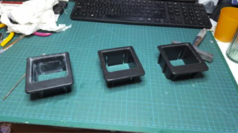 各種用於車輛的小零件。原始版(左),列印初版(中)和經過後製版(右)
